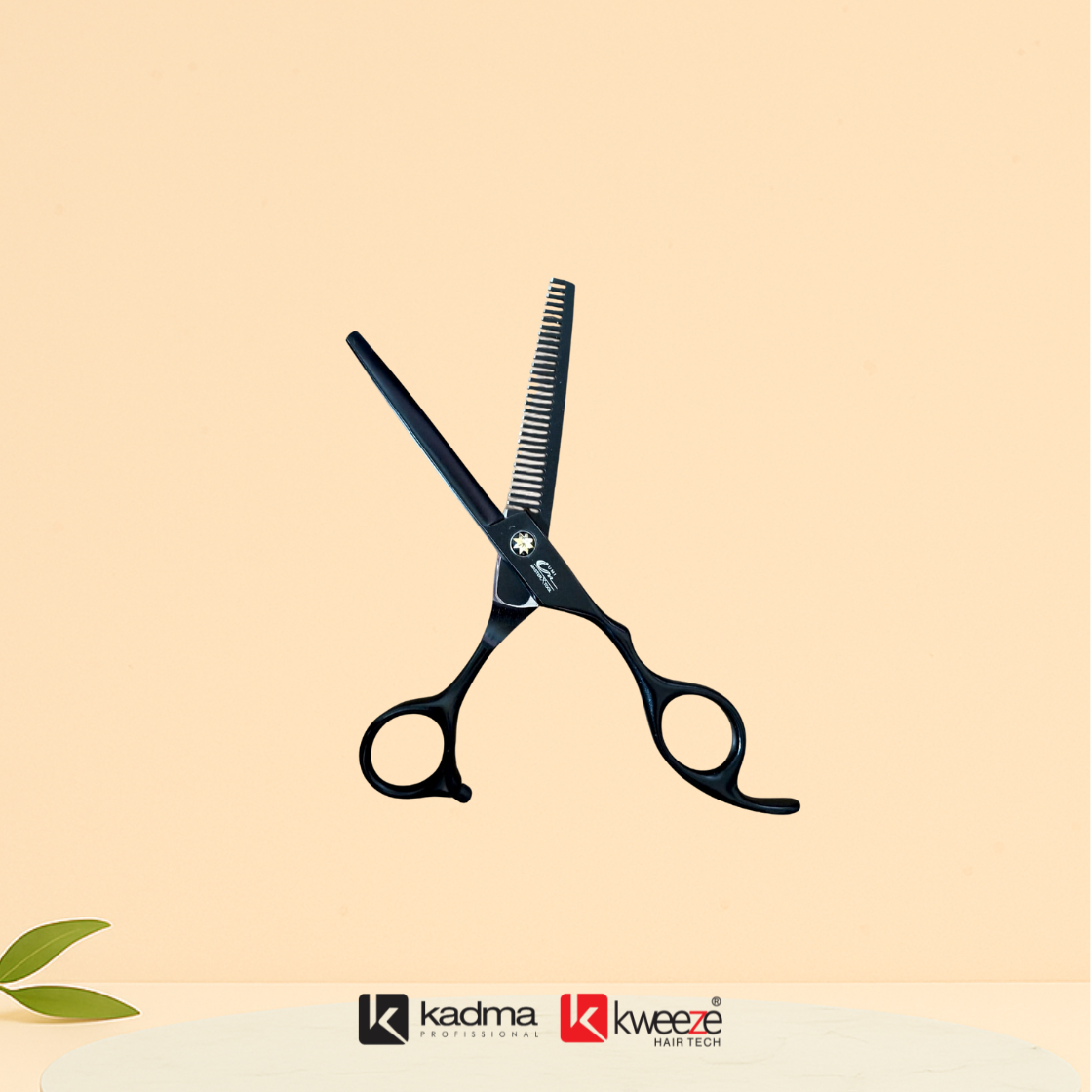 Fabricada em 100% aço inoxidável, possui lâminas afiadas com fio navalha, facilitando o deslizamento e garantindo acabamento preciso em todos os tipos de cabelo. Seu acabamento preto confere elegância e durabilidade, com destaque para a pedra amarela na intersecção das lâminas — um toque sofisticado ao design.